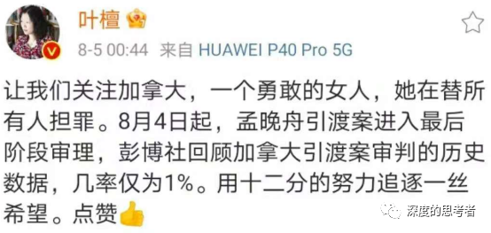 8月4日起,孟晚舟引渡案進入最後階段審理,彭博社回顧加拿大引渡案審判的歷史數據,幾率僅為1%。用拾贰分的努力追逐壹絲希望。點贊