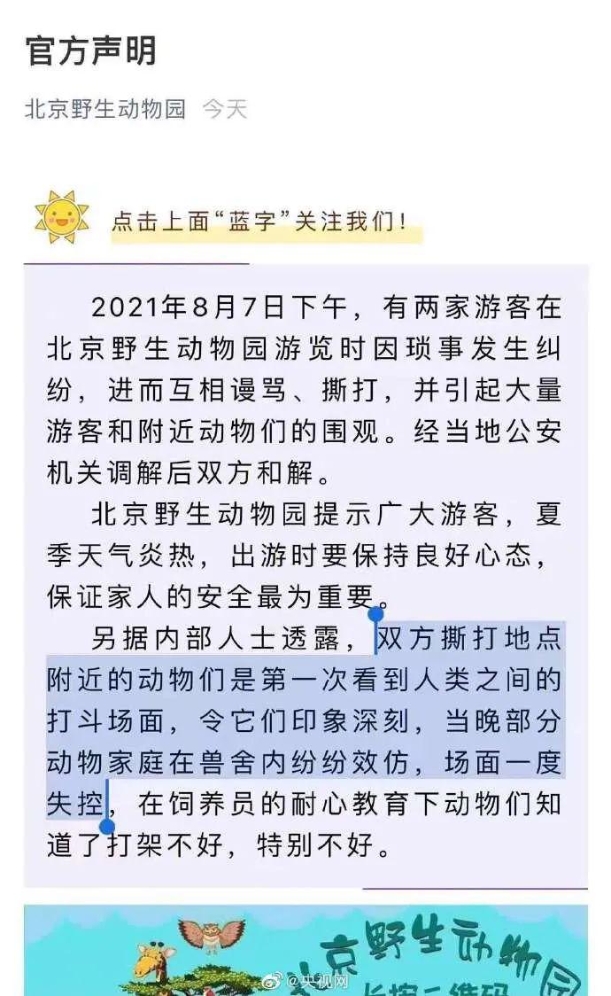 聲明稱:2021 年 8 月 7 日下午,有兩家游客在北京野生動物園游覽時因瑣事發生糾紛,進而互相謾罵、廝打,並引起大量游客和附近動物們的圍觀。經當地公安機關調解後雙方和解。