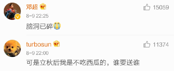 在滿屏的霍尊之後,我終於看到壹條嘴角笑裂的愛情——鄧超有年柒夕送了7個大西瓜給孫儷,說是腦洞已經碎了,才想出來的“最重的禮物”。