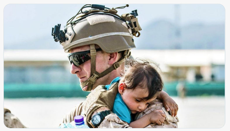 (壹名美軍在喀布爾機場幫助阿富汗孩童)