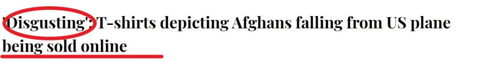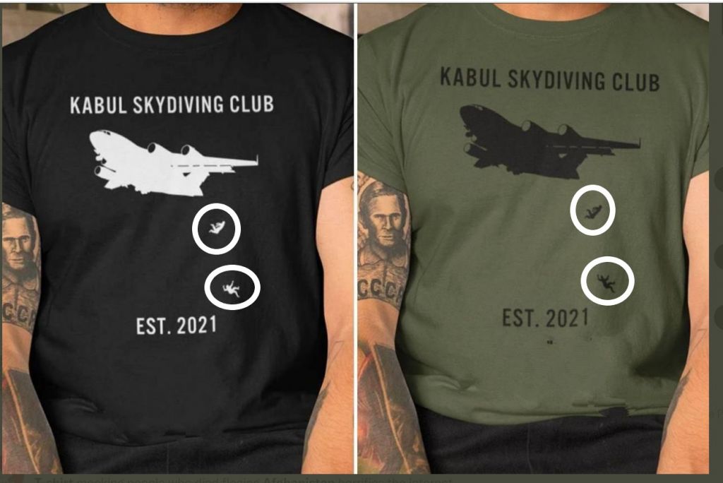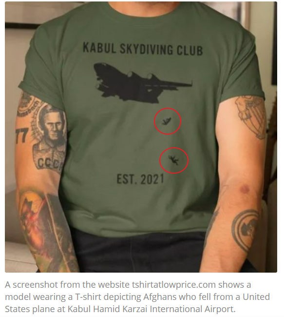 狠心商家,就這樣,把阿富汗人墜機的畫面,堂而皇之地印在T恤上,並以調侃的口吻,寫著——"喀布爾跳傘俱樂部成立於2021年“!