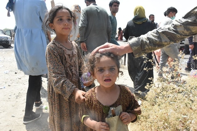當地時間2021年8月22日,阿富汗喀布爾,喀布爾國際機場附近,阿富汗兒童正在接受土耳其士兵分發的水和食物。 視覺中國 圖聯合國機構發出警告稱阿富汗最早將在9月出現糧食短缺問題,隨著喀布爾國際機場限制增加,包括醫療器材和嚴重營養不良救援包在內的救援物資都無法進入阿富汗境內。