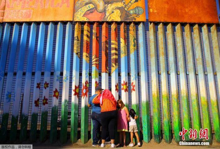 资料图:当地时间2016年11月6日,墨西哥提华纳,移民家庭隔着美墨边境之间的隔离墙聊天。