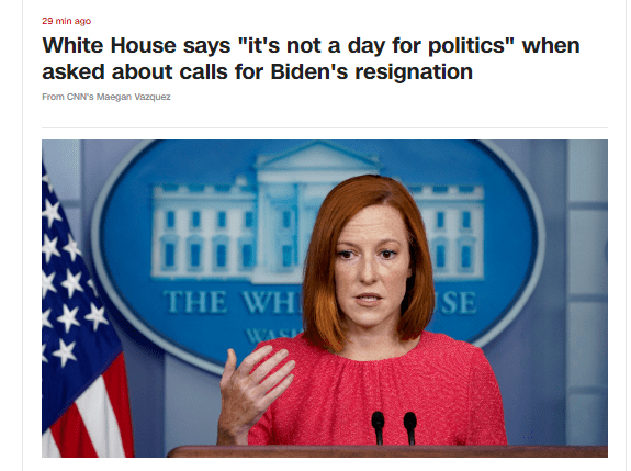 喀布爾機場附近26日晚發生爆炸已致73人死亡。據CNN剛剛消息,事件發生後,共和黨人要求總統拜登辭職, 白宮對此說:“今天不是(談論)政治的日子。”