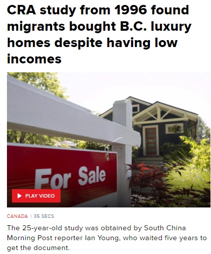 根據南華早報記者 Ian Young 獲得的加拿大稅務局的研究顯示,25年前,即1994 年兩個月期間,在本拿比價值超過 80 萬元豪宅的 37 位指定買家中,有 33 位是新移民,他們申報的家庭全球平均收入僅為 16,430 元。在同壹時間段內,4名同類房產的指定的長期居民買家所申報的收入為 263,701 元。