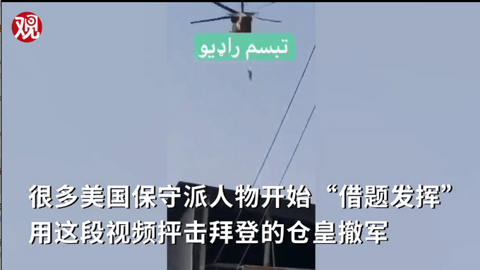 然而,許多推特用戶在沒有證據的情況下稱這是塔利班用直升機實施“絞刑”,甚至有人聲稱飛機上吊著的男子是美國翻譯。壹些美國保守派人物開始“借題發揮”,用這段視頻抨擊拜登的倉皇撤軍。
