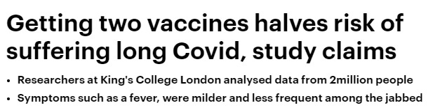 “這壹結果表明,在接受雙重疫苗接種的個體中,長期 Covid 的風險降低了,另外考慮到已經記錄在案的總體感染風險降低了。”