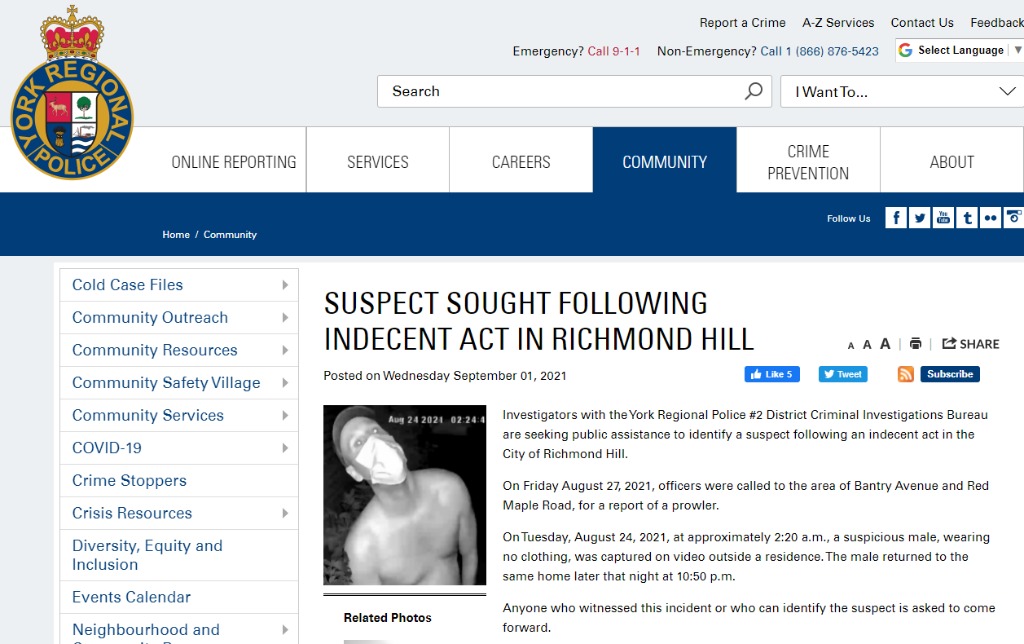 8 月 27 日星期伍,警方接到警報,稱在 Richmond Hill 的 Bantry Avenue 和 Red Maple Road 地區,有壹名裸體徘徊者。