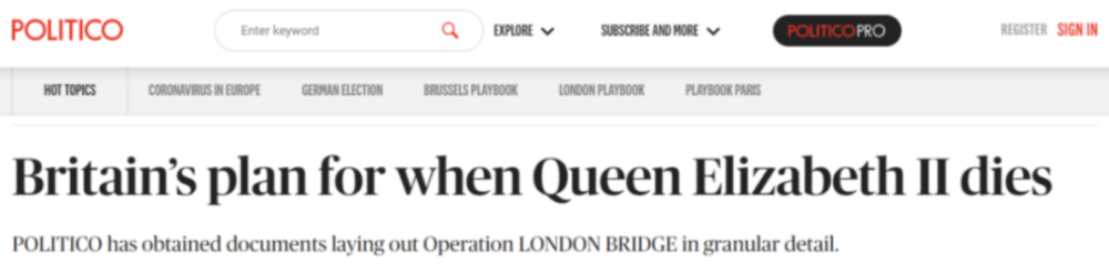 早在上世紀60年代,英國政府應對“女王駕崩”的操作細節就已經開始秘密籌劃,最終形成為期10天的“倫敦橋計劃”。然而,這份本該在女王去世以後公布的葬禮計劃,竟在女王健康狀況良好的情況下,被美國政治新聞網站“政客”(Politico)事無巨細地向全世界公布。這在歷史上還是頭壹遭。
