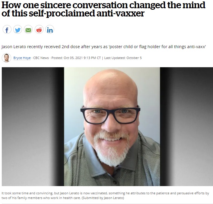 47 岁莱拉托是温尼伯一家货运公司的调度员,也是两个孩子的已婚父亲。几周前,由于和从事医疗保健专业的家人进行了一次平静的交谈,他决定接种新冠疫苗。