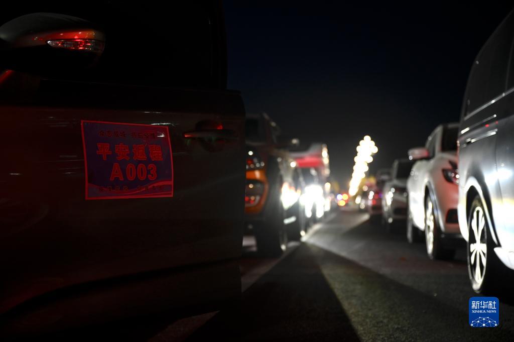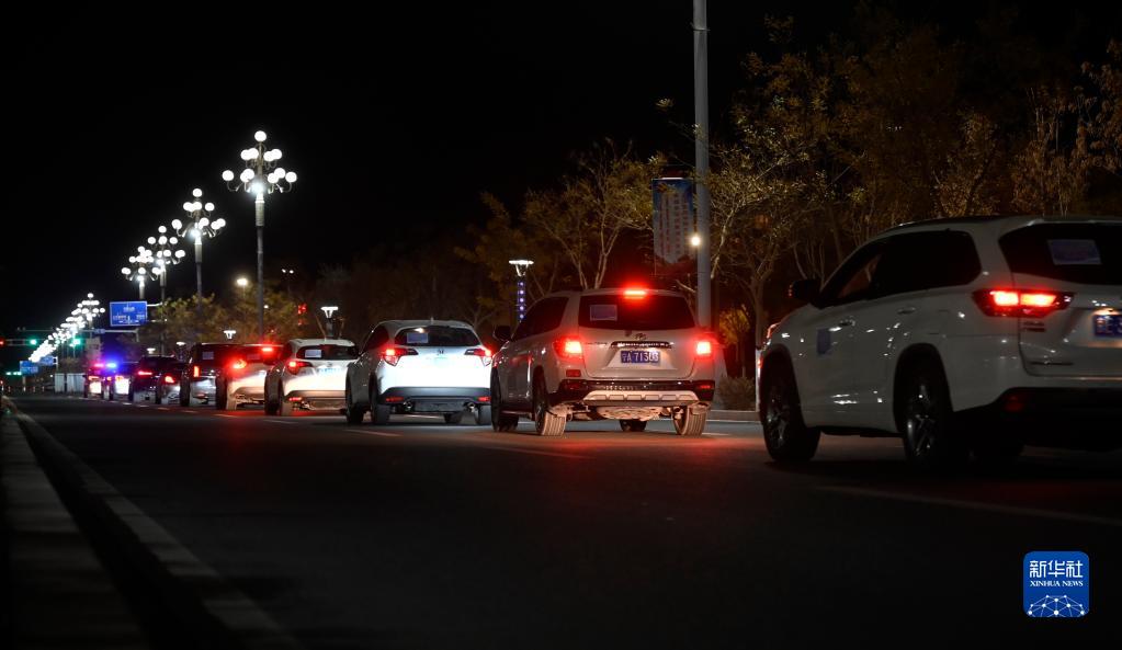 10月28日晚拍攝的即將離開額濟納旗的滯留自駕游客車隊。 當日,因疫情滯留額濟納旗的自駕游客開始返程,首批返程自駕游客共有128人,駕駛車輛42台。自駕游客車隊在公安車輛引導下,啟程前往阿拉善左旗敖倫布拉格鎮,到達後在酒店隔離14天,符合相關條件可以自行返家。 新華社記者 王雪冰 攝