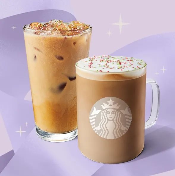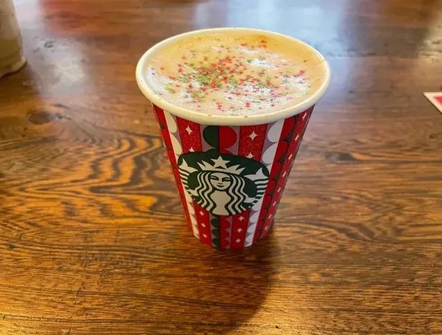 飲料是由濃縮咖啡、甜曲奇糖漿和燕麥飲料制成,然後撒上紅色和綠色的糖粒,簡直太有聖誕節的感覺了!