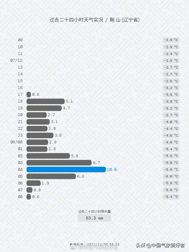 比如遼寧鞍山,鞍山從昨天傍晚前後出現降雪,並且在夜裡逐漸加強,在昨夜今晨降下超級特大暴雪,截至11月8日上午8點,鞍山降雪量已高達63.3毫米,特大暴雪標准為24小時降雪量超過30毫米,鞍山的降雪量已經達到特大暴雪標准的兩倍!在凌晨更是出現了最大1小時10毫米的凶猛豪雪。如果是下雨,1小時10毫米已經是不小的暴雨,1小時10毫米的暴雪,那是爆米花壹顆挨著壹顆鋪滿整個天空掉下來,如果你在外面,那是密密麻麻,會有壹種窒息感,單論純雪量已超過2007年元宵節暴風。