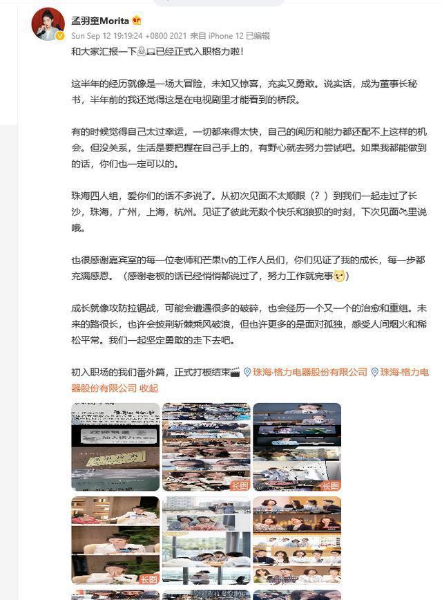 hello 大家好 ~ 我是孟羽童小孟,跟大家匯報壹下:我現在已經正式入職格力兩個月了,擔任的職位是格力電器董事長董總的秘書。