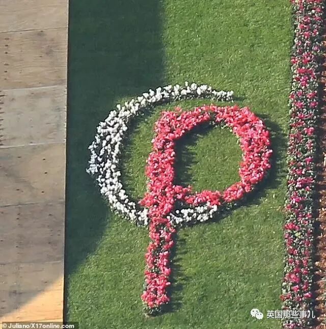 庄园院子里搭了舞台和帐篷,可以举行典礼,草坪上还用花摆出新人名字的首字母“C”和“P”。