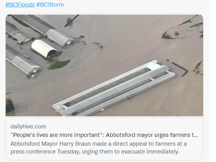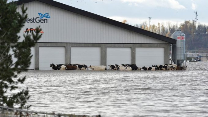 加拿大BC省遭遇500年壹次特大暴風雨導致創紀錄的洪水和泥石流重大災害,造成橋梁倒塌、高速公路關閉,數個城市崩潰,兩萬人流離失所,超過2,000頭奶牛死亡。。。