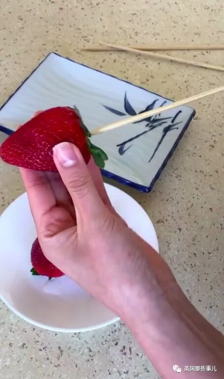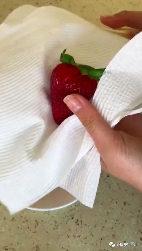 先把草莓洗幹淨,用廚房紙把它表面的水分吸幹。
