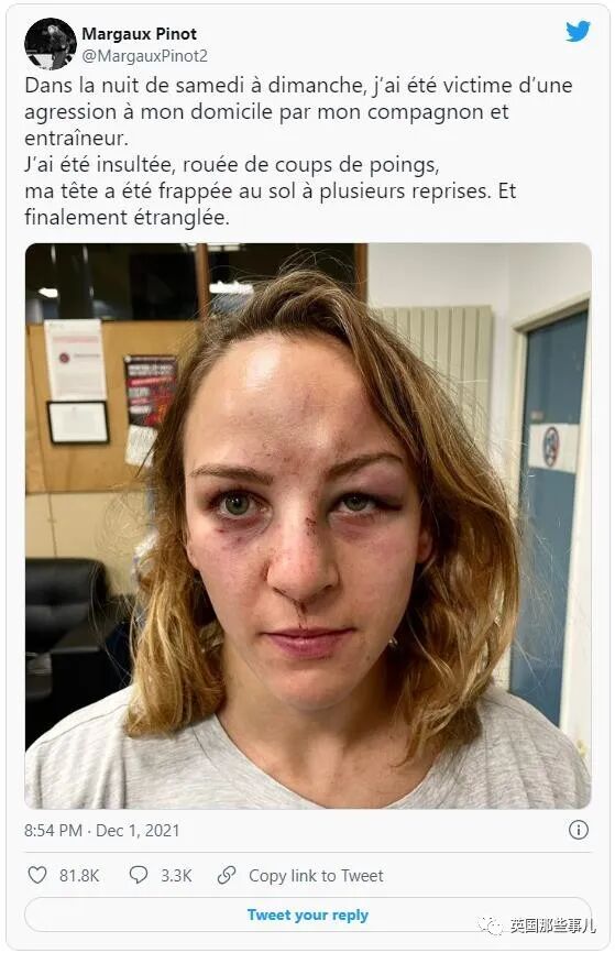 近日,她公开自己被打成“熊猫眼”的照片,声称遭到38岁男友兼教练施密特(Alain Schmitt)的家暴。