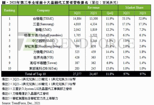 根据12月2日知名市场调研机构集邦咨询公布的,2021年第三季度全球前十大晶圆代工厂营收排行榜可知: