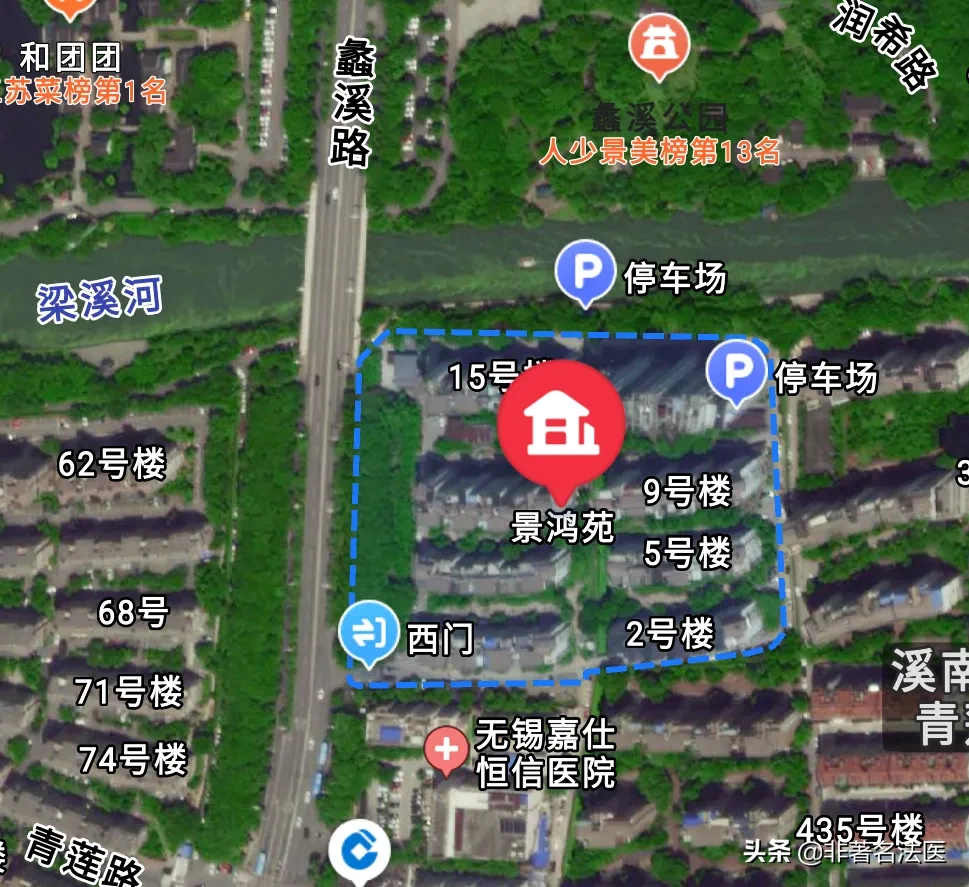 從衛星地圖上看,景鴻苑北門外側就是梁溪河,景鴻苑附近還有別的小區,梁溪河的兩端是蠡溪路和西快速內環,這些地方的所有攝像頭是不是應該也要調壹下。