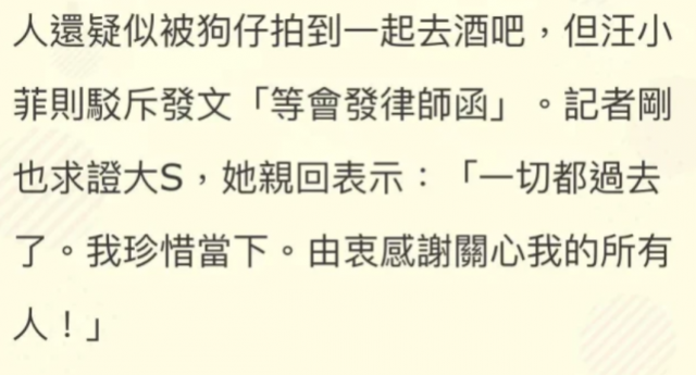 據悉,在爆出汪小菲疑似出軌張穎穎後,大S接受了媒體采訪,就關於汪小菲出軌壹事,她回應說“壹切都過去了”,看似簡單的六個字,卻壹點不比李靚蕾的長文“殺傷力”小,很多網友紛紛猜測大S是話裡有話,這不替汪小菲否認的行為,難道是想暗示什麼?