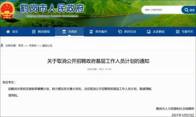 12月23日,鶴崗市人民政府在其官方網站發出通知,因鶴崗市政府實施財政重整計劃,財政狀況發生重大變化,決定取消公開招聘政府基層工作人員計劃,敬請理解。上述通知引發網民熱議。網民大麗花25留言寫道,經濟好,老百姓的工資也高不到哪裡去,紅利都被公仆們吸走了。另有網民留言,網紅城市鶴崗市又上熱搜了,原因是政府發了壹個文件,通俗點兒說,政府沒錢了,養不起那麼多公務員了,幹脆不招人了。