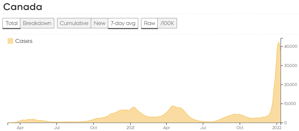 加西網報道:在Omicron肆虐引發加拿大病例海嘯般增長後,目前疫情出現了轉機,新增曲線開始下降。