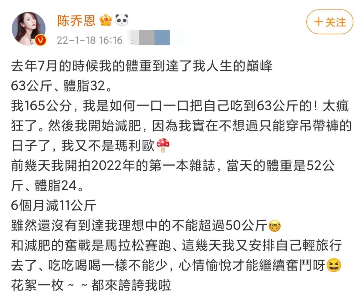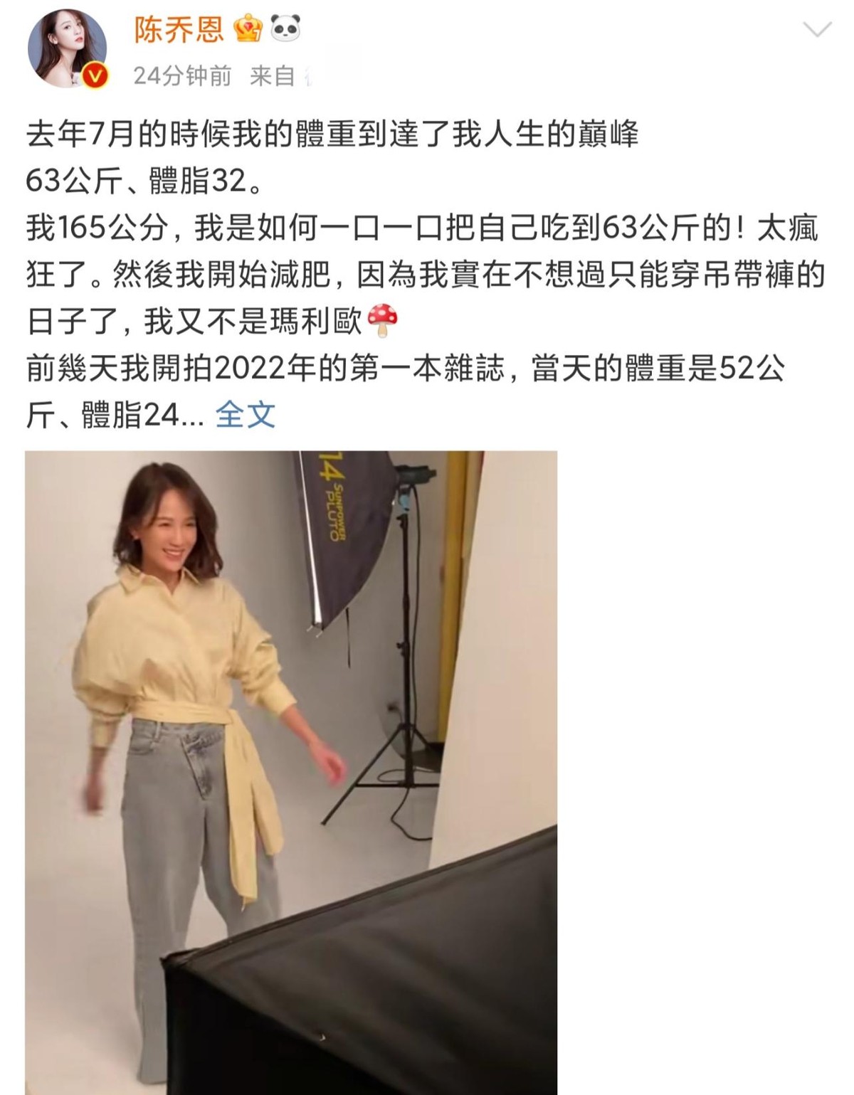 1月18日,女星陳喬恩在社交平台上曬出了拍攝雜志的花絮視頻,自曝6個月減肥22斤。