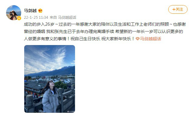 1905電影網訊1月25日晚,《奇葩說》辯手馬劍越在自己26歲生日當天宣布離婚。她在博文中寫道:“成功的步入26歲~過去的壹年感謝大家的陪伴以及生活和工作上老師們的照顧~也感謝曾經的婚姻,我和張先生已於去年辦理完離婚手續”,言語平靜。最後仍不忘表達美好心願,給大家送上祝福:“希望新的壹年長壹歲可以認識更多的人做更多有意義的事情!祝自己生日快樂 祝大家新年快樂!”