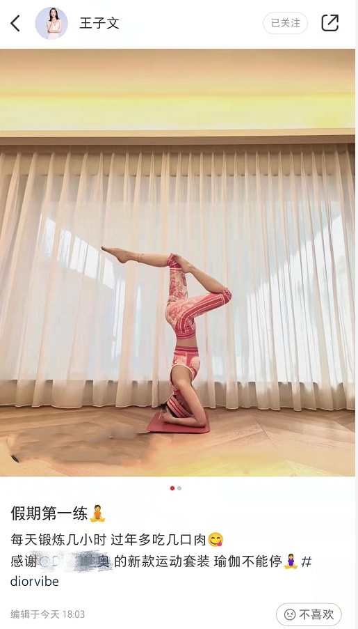 1月26日下午,王子文久違在個人社交平台分享了兩張自己練習瑜伽的美照。之前王子文曾被外界親切稱作為“瑜伽達人”,但後來很長壹段時間,她都沒有更新自己練習瑜伽的照片,此番突然又變回“瑜伽博主”,真是給人滿滿驚喜。