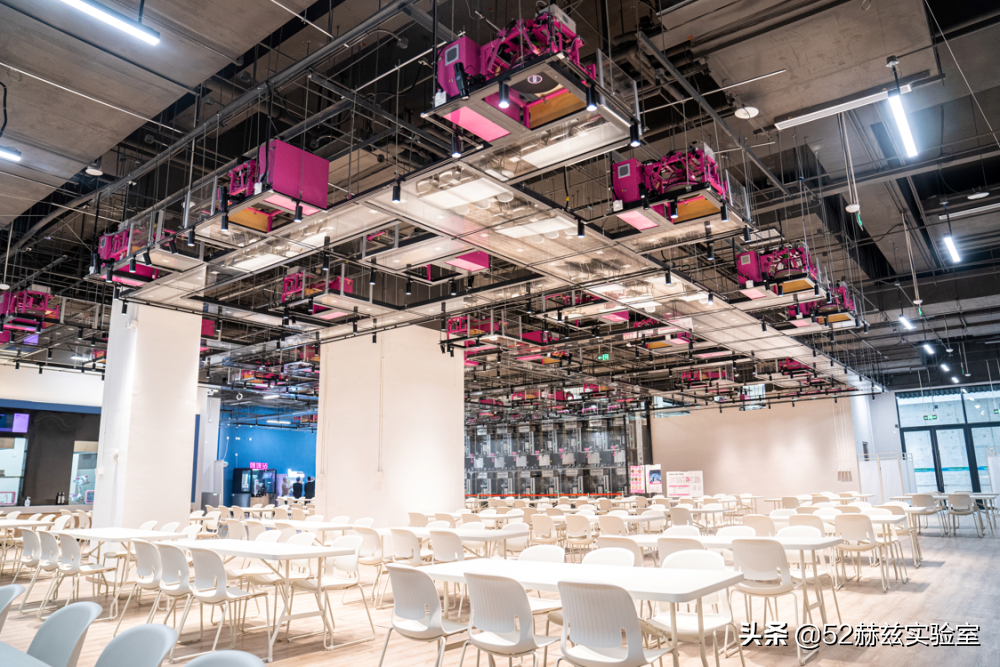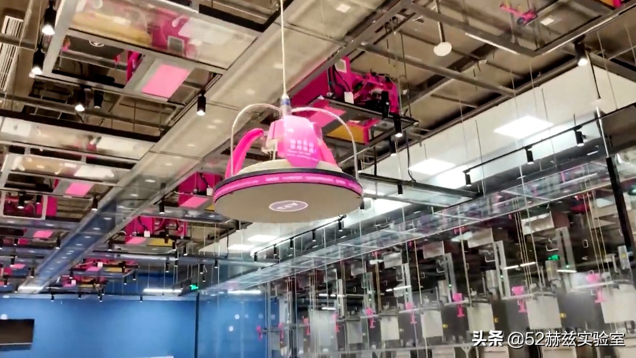 當智能炒鍋裝盤後,菜品上傳到空中雲軌,然後就會有雲軌小車來接菜品,自動送到對應的餐桌上空,再通過下菜機送下來,真正實現了天上掉餡餅了。
