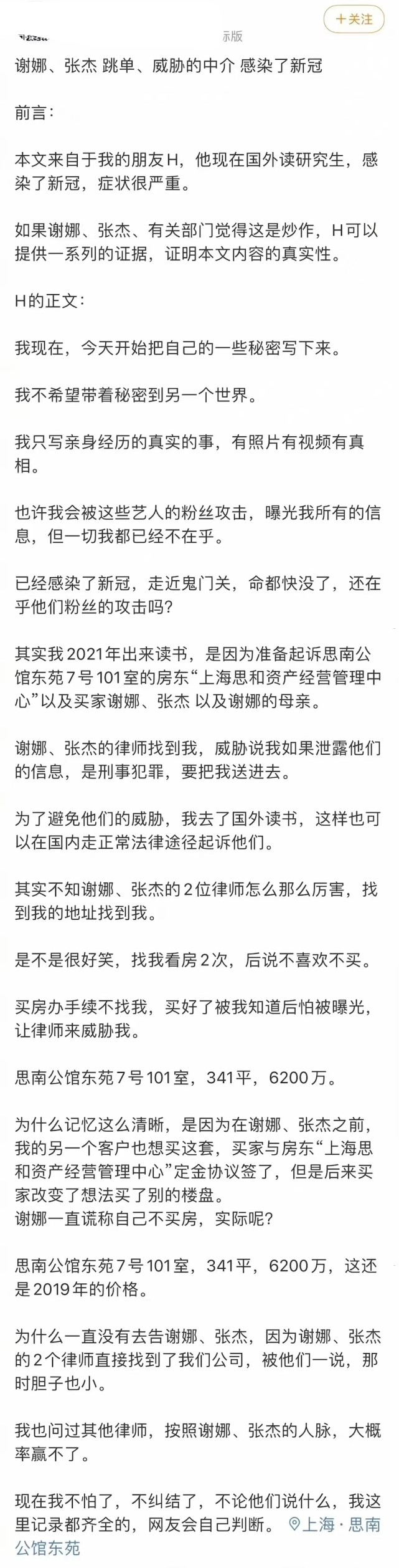 虎年伊始,張傑與謝娜便招惹出“是非”,壹位化名為H的房產經紀人在網絡上發布壹篇文章,爆料張傑與謝娜買房跳單(從中介處看房卻避開中介私自交易)。