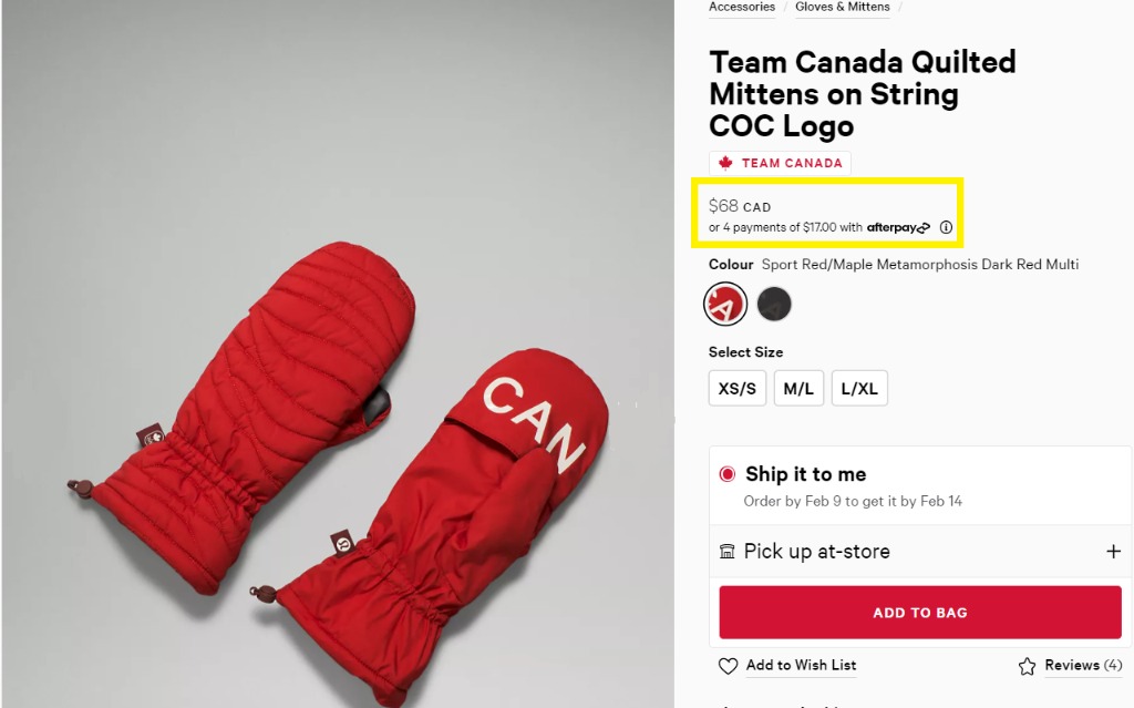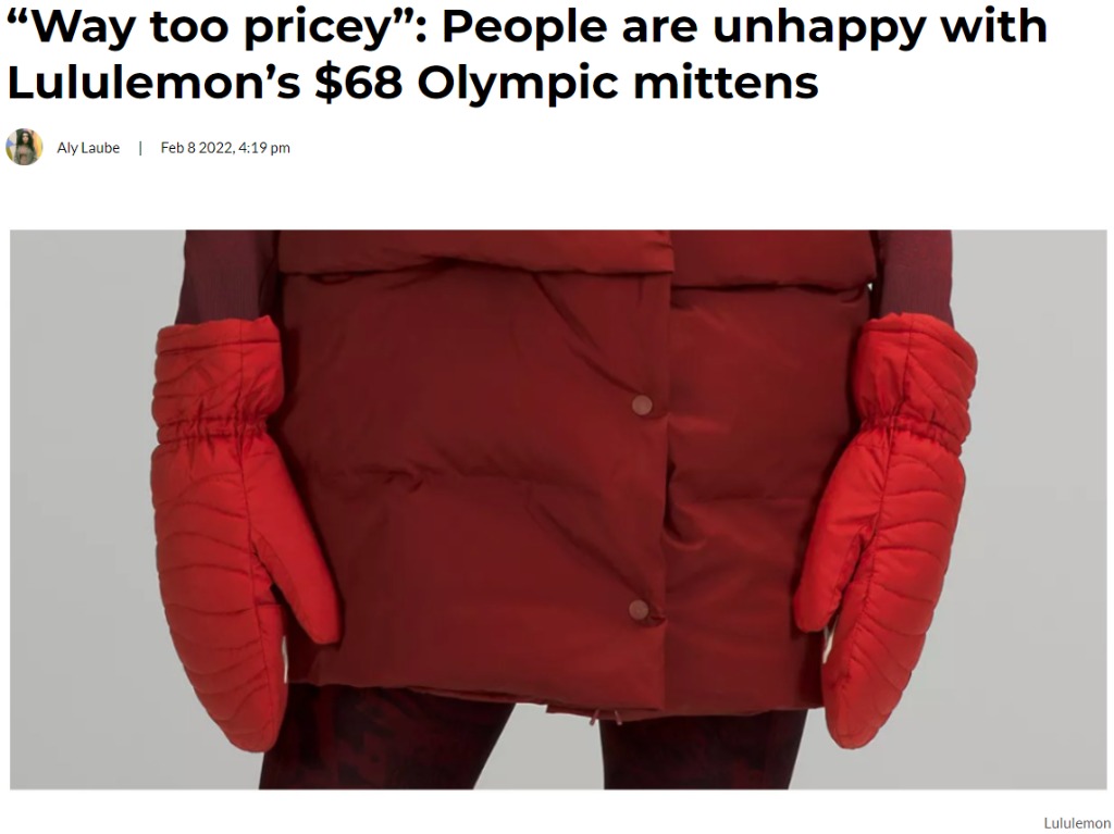 Hudson's Bay壹雙紅色針織連指手套的售價約為20元,而Lululemon今年推出的滌綸填充絎縫連指手套的售價為68元。