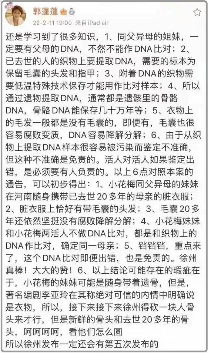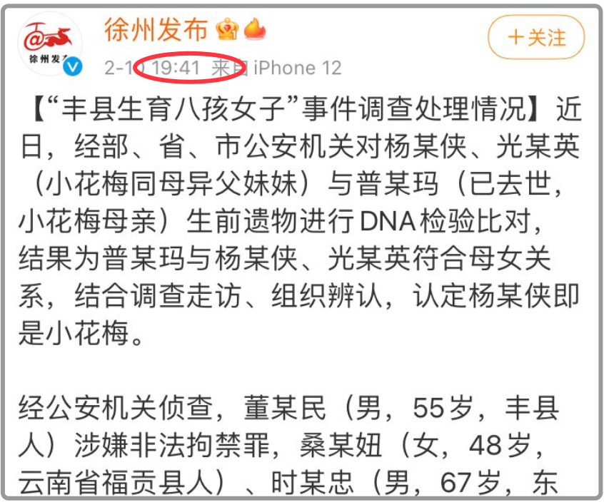 但是對比之前的豐縣通報,通報則中是已經確認“八孩母”就是小花梅,而且通報還表示,這是走訪了大量村民得出來的結論,而且還用DNA技術進行了身份比對確認,等等…