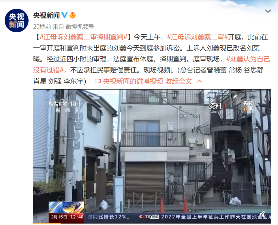 今天上午,江母訴劉鑫案贰審開庭。此前在壹審開庭和宣判時未出庭的劉鑫今天到庭參加訴訟。上訴人劉鑫現已改名劉某曦。經過近肆小時的審理,法庭宣布休庭,擇期宣判。庭審現場,劉鑫認為自己沒有過錯,不應承擔民事賠償責任。(總台記者曾曉蕾 常楊 谷思靜 肖星 劉強 李東宇)
