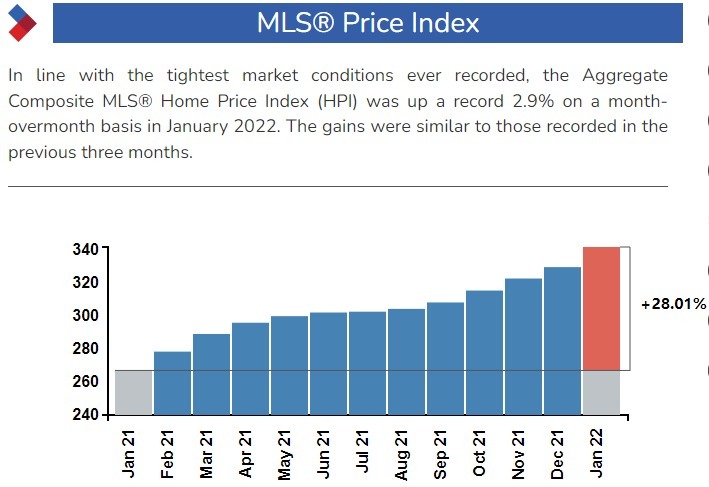 与此同时,2022 年 1 月,MLS® 综合房价指数 (HPI) 环比上涨了创纪录的 2.9%,这一涨幅与前三个月的涨幅相似,相比去年同期 HPI 的涨幅已经超过 28%。