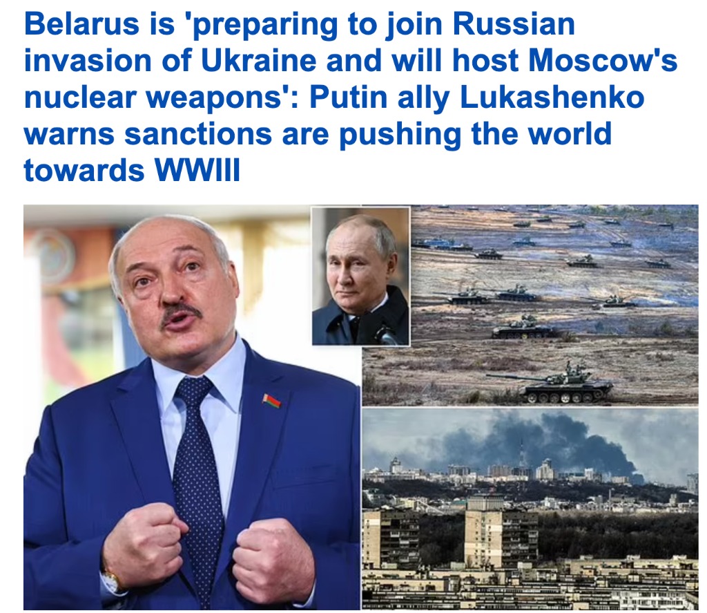 盧卡申科周日晚間發出令人不寒而栗的威脅,稱西方對俄羅斯的制裁,正在將克裡姆林宮推入第叁次世界大戰,此前普京將其核威懾力量置於“警戒”狀態。