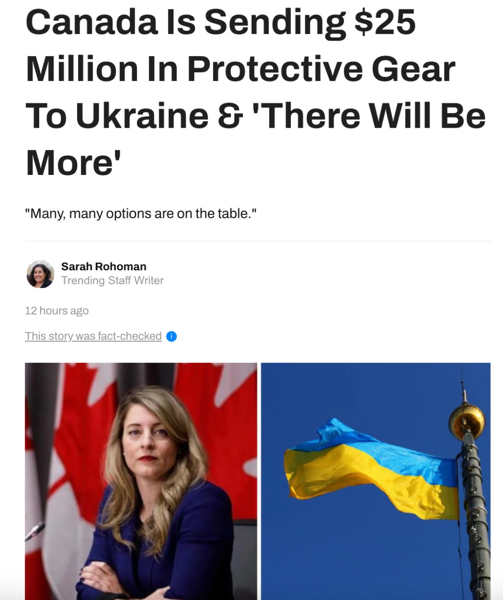 “他們需要頭盔、防彈衣和防毒面具。加拿大正在提供價值 2500 萬元的額外防護裝備,而且還會有更多。”