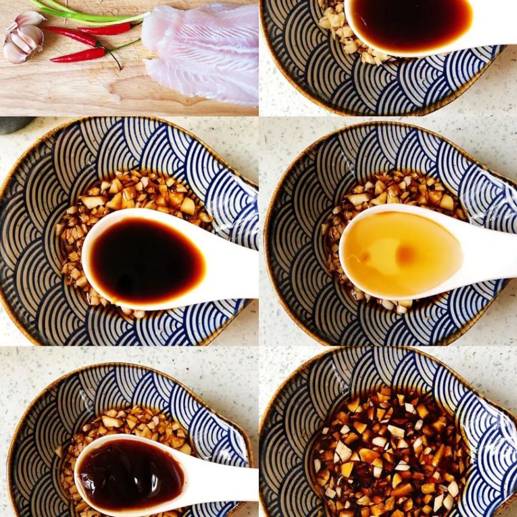 02. 大蒜切沫,加入3勺蒸鱼鼓油、1勺生抽、1勺蚝油、1勺食用油,搅拌均匀成蒜蓉汁。