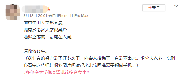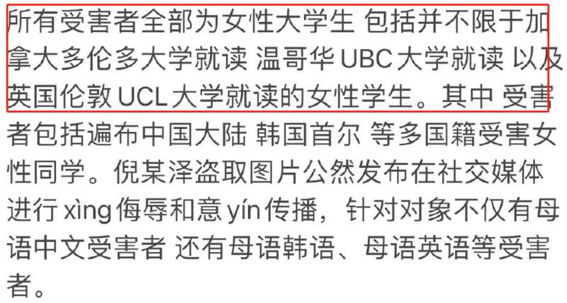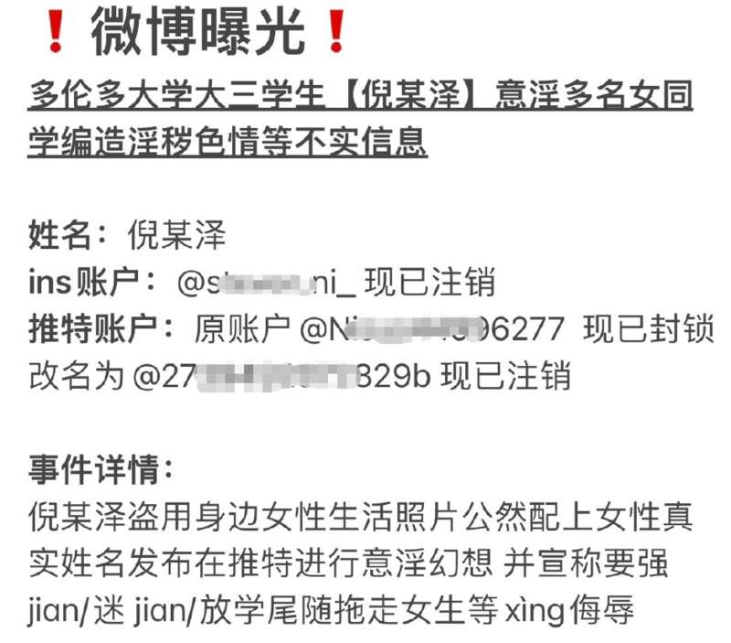據該網友在微博發布的信息稱,多倫多大學大叁的壹名學生【倪某澤】,通過添加同校多名女生的微信,獲取真實名字,還盜用了女生instagram以及朋友圈的各種照片,在推特上發布後,又配上了諸多不堪入目的淫穢詞語,對受害人的生活和身心,造成了嚴重的影響。
