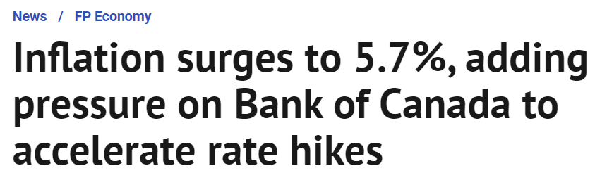 今天,加拿大統計局表示上個月(2月份)消費者價格同比飆升至 5.7%,高於 1 月份的 5.1%,為 1991 年 8 月以來的最大漲幅。