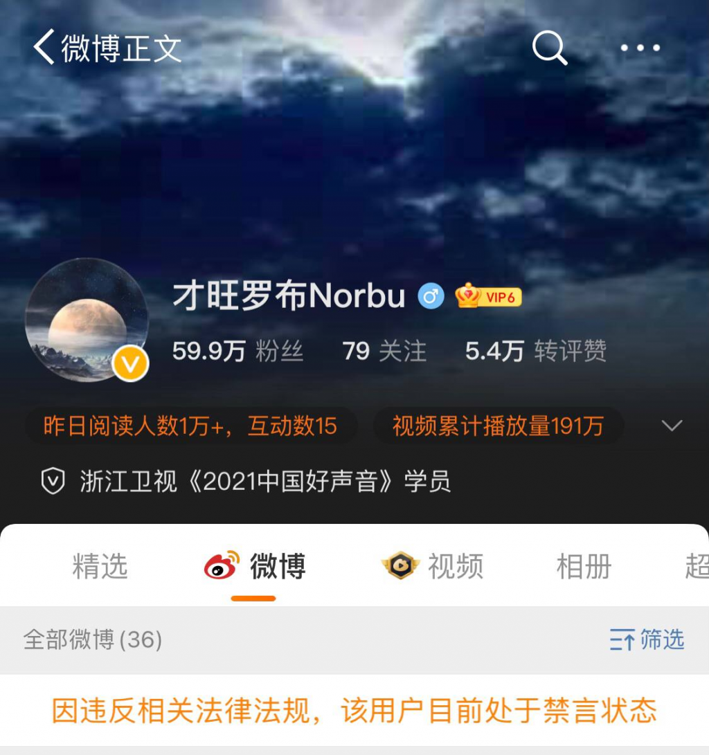 3月16日,據電報頻道 @簡中賽博墳場 的消息,微博用戶@才旺羅布Norbu 已被禁言,所有微博被禁止點贊。