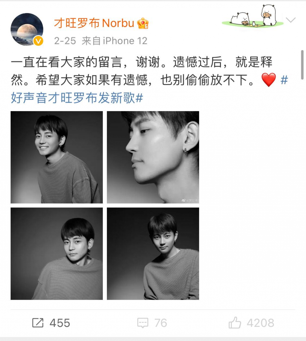 @才旺羅布Norbu 的最後壹條微博消息發布於2月25日,這成為他最後的留言,消息除預告新歌發布,還提到“遺憾過後,就是釋然”。