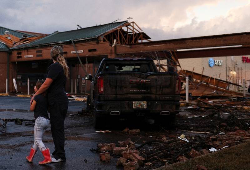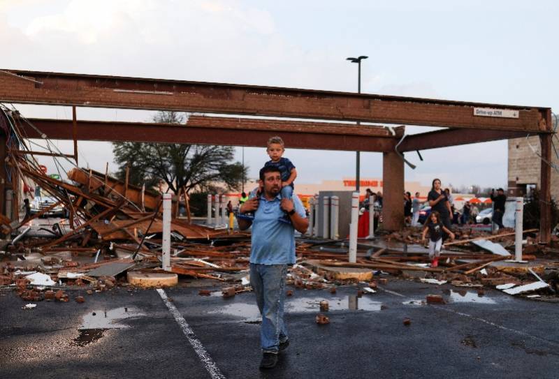 3月21日,在美國得克薩斯州朗德羅克,壹名男子帶著孩子經過壹家受損的購物中心。新華社/路透