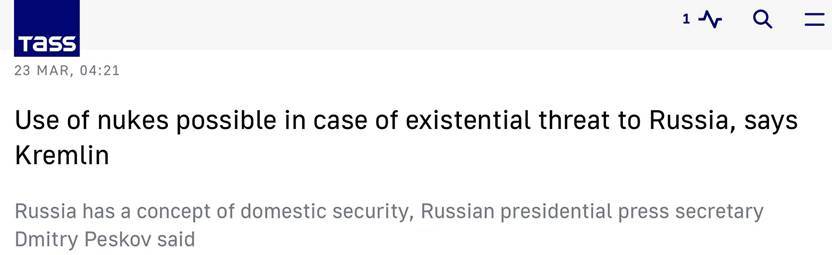 據報道,當被問及俄羅斯是否可以完全排除使用核武器(的可能性)時,佩斯科夫回答稱“我們有壹個國家安全概念。而且,你可以閱讀到所有使用核武器的理由。因此,如果它是對我們國家的生存威脅,那麼就可以根據我們的戰略來使用(核武器)。”佩斯科夫補充稱:“還有壹些其他的理由,在該文本中也提到了。”