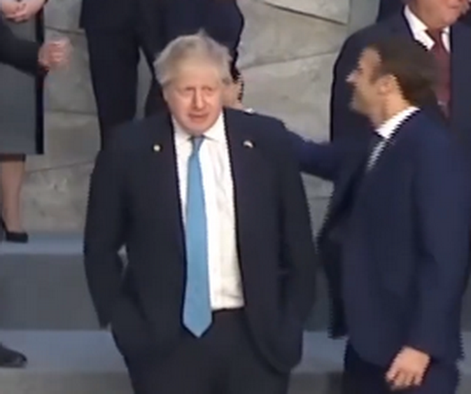 “約翰遜在北約集體合影時受其他領導人的冷落,獨自站立”,《倫敦旗幟晚報》以此為標題描述現場這壹幕。據現場視頻顯示,參會的領導人在會議合影環節開始前愉快地互相問候,而鮑裡斯·約翰遜則把手插在口袋裡,站在壹旁尷尬地來回踱步,而與之形成對比的,是約翰遜身後的法國總統馬克龍正在與參會者壹壹握手交談。