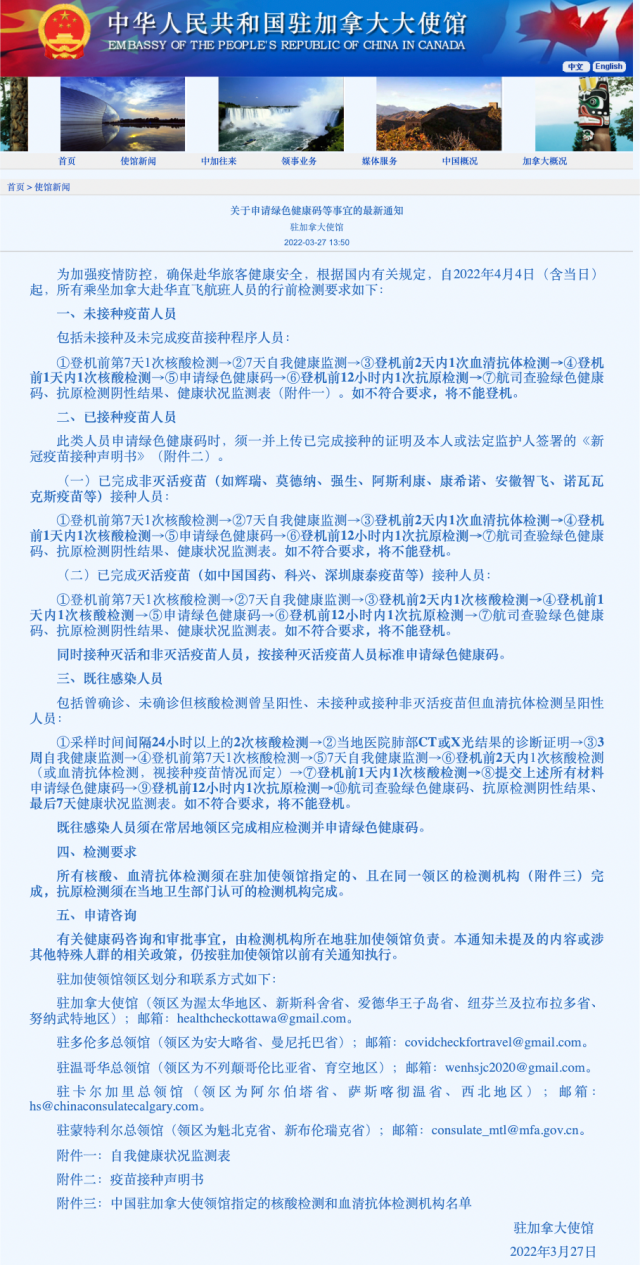 中國駐加拿大大使館於3月27日發布官方通告《關於申請綠色健康碼等事宜的最新通知》。自2022年4月4日(含當日)起,所有乘坐加拿大赴華直飛航班人員需要遵循登機前7天4次檢測新規。