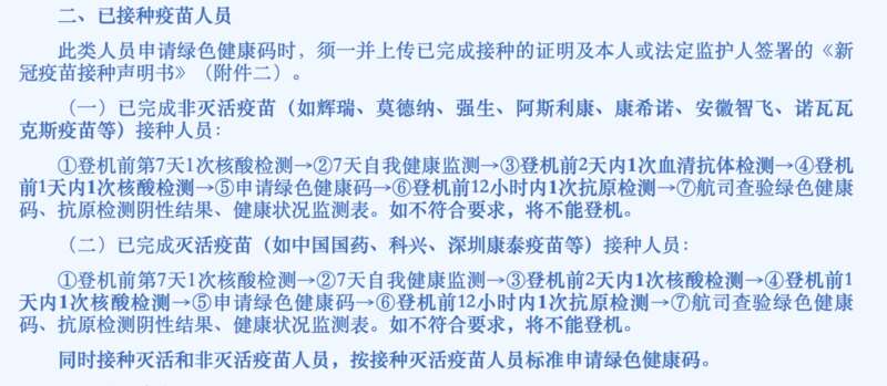 (贰)完成疫苗接種程序人員(包括滅活疫苗和非滅活疫苗),登機前需要完成以下檢測: