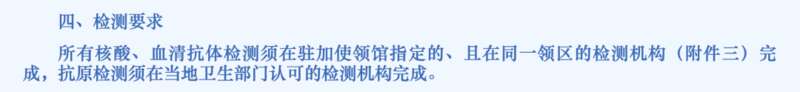 需要注意的是,所有核酸、血清抗體檢測須在駐加使領館指定的、且在同壹領區的檢測機構完成,抗原檢測須在當地衛生部門認可的檢測機構完成。