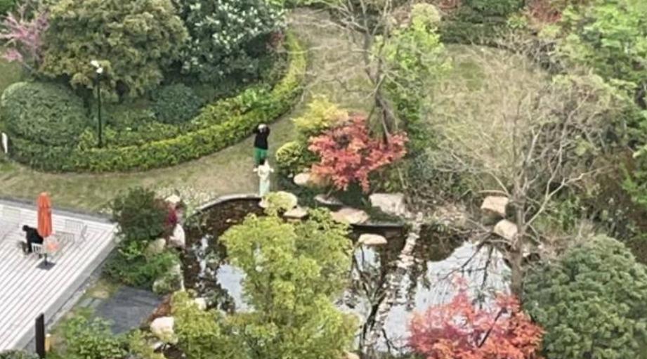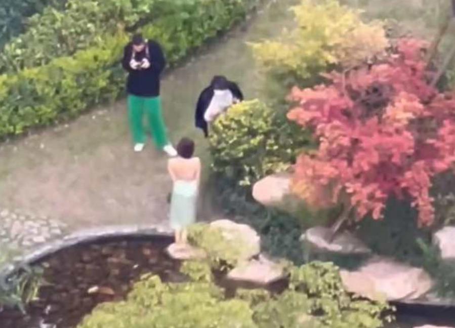 傍晚 5 點 40 分,樓上的業主拍下了這壹幕:在小區水池旁,壹位女網紅身著清涼綠色長裙,背後是壹片袒露,正在擺著各種姿勢拍照。